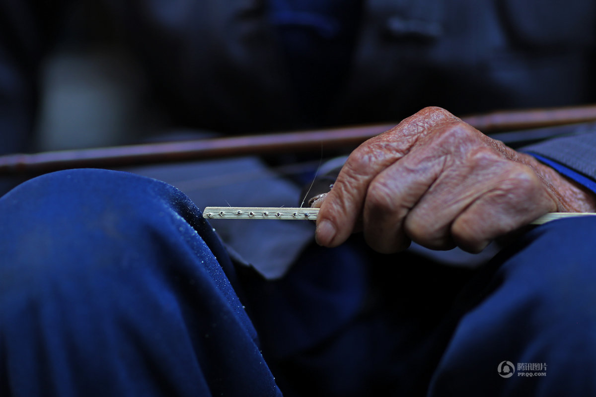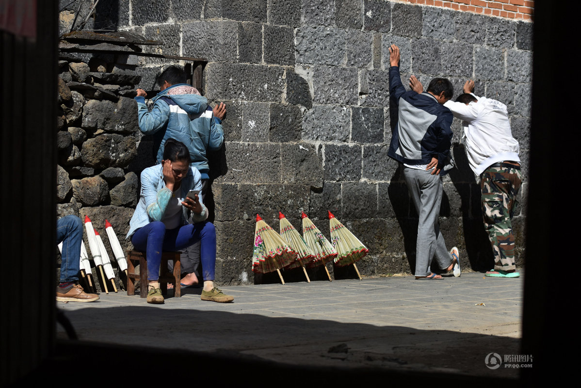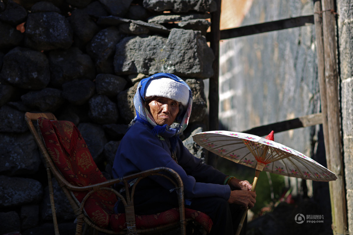 鄭さんの奥さんは、太陽が照っているとき、未完成の傘を乾かすために、手に持って手伝っています。現在村で傘を作ることができるのは4人の老人のみになりました。